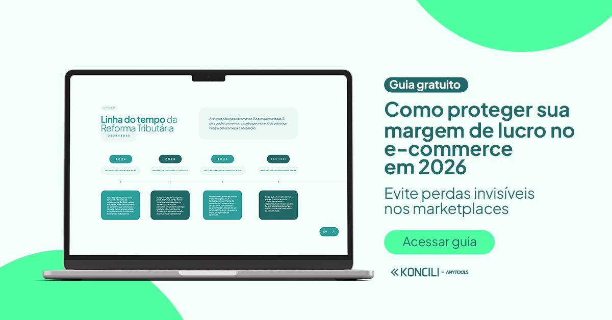 Baixe o e-book completo para aprofundar sua leitura sobre tributação no e-commerce e entender como estruturar sua operação com mais previsibilidade. O Koncili atua exatamente nesse ponto, ajudando você a enxergar o que realmente entrou no caixa e tomar decisões com base em dados, não em percepção.